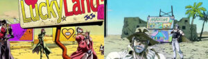 まずは最初の看板のシーンから見ていきます。夜が明けて日が昇り、砂の上にたたずむ承太郎たちが順番に映し出されていましたが、その後ろにはアラビア語や「LUCKY LAND」などの文字が書かれた看板が描かれています。