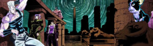 右岸ではアヴドゥルの前に炎、その後ろにイギーが描かれ、ヴァニラ・アイス戦での炎の探知機と2人で旅立った姿を思い出します。あとね、イギーの顔が少しずつ凛々しくなっているの気づいた???ついにカッピョイイイギーになったよ!