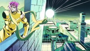 続くシーンでは花京院が建物の窓辺に映し出され、朝日が昇ります。