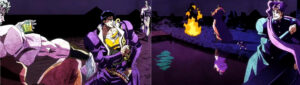 花京院のポーズはこのシーンの承太郎と、ポルナレフは1番最初の看板のシーンで登場した承太郎のポーズとほぼ左右対称です。