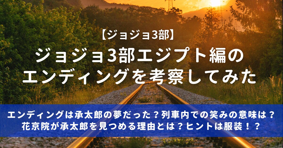 ジョジョ3部エジプト編のエンディングについて考察してみました。原作通りのシーンばかりではなかった映像ですが、それは旅の思い出と承太郎の理想が入り混じっているからなのかもしれません。