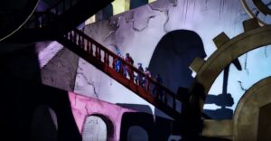 次は承太郎たちが階段を上るシーンです。建物内には階段とU字状の穴が開いており、DIOの館でケニーGが仕掛けた罠にそっくり!