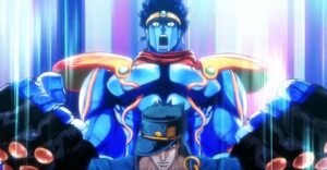 中央には承太郎が立っており、階段が破壊される中でスタープラチナが登場。雄叫びを上げる姿は、ンドゥール戦での勝利シーンを思い出します。