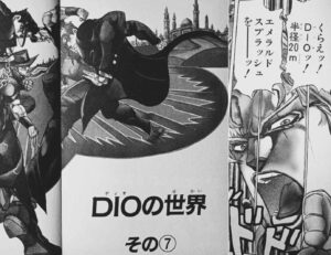 左は見開き絵、右はDIOに半径20mエメラルドスプラッシュを食らわせようとするシーンが元ネタでした。