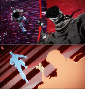 最後のパートは階段を上がってくる承太郎の右手の拳がスタープラチナに変化して、ラッシュを繰り出すところから始まります。通常オープニングではザ・ワールドは割れたガラスの破片に薄っすらとだけ、承太郎の背後には影DIOが映りますが、特殊オープニングでは両者の姿がはっきりと出現!「ザ・ワールド!」の掛け声とともに時が停止し、DIOだけが止まった時の中を動きます。