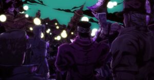 ラッシュ後のタイトル画面では、文字周りには承太郎らの人数と同じ6つの大きな星が輝いていました。後ろから強い光が現れ、タイトルが塵になる様子は、DIOが太陽の光で消滅するかのようです。