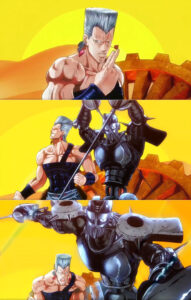 それぞれ「あばよイギー」とアヴドゥル死亡直後の2コマの顔に似ています。シルバーチャリオッツはアヌビス二刀流の構えでした。