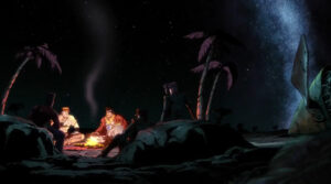 砂漠ではしゃぐポルナレフを挟み、夜空の下で5人が焚火をするシーンへ。