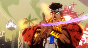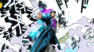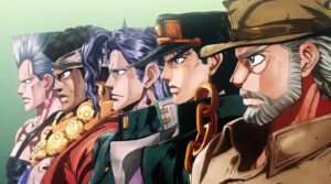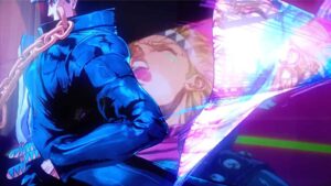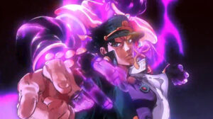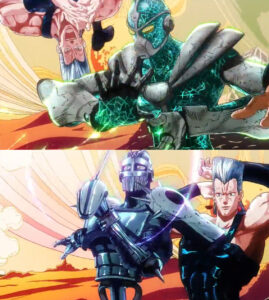 次のシーンでは「STAND UP!」の歌詞に合わせて、ジョセフから順番に各キャラクターがスタンドを繰り出します。アヴドゥルは手を十字型にしてスタンドを出すことが多いですが、ここでは指を立てていました。