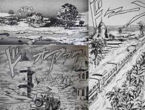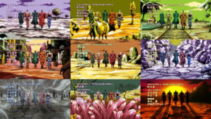 場面が切り替わると、横並びの承太郎たちが各国を背景に歩いていきます。すべて元ネタのあるシーンで、左上からインドが2枚、ミャンマー、インド、パキスタンへの入国時、運命の車輪戦の山道、エンヤ婆のホテルがあった墓、審判戦の島、エジプト上陸時の紅海でした。