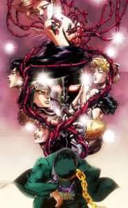 歴代のジョースター家関係の人物が映し出される場面は、苦しむホリィさんから茨が伸びており、長きにわたるディオとの因縁の系譜を彷彿とさせます。後ろでは石仮面も目を光らせていますね~!ジョナサンはディオの首を抱えており、彼もまたジョースター家の関係者となっているようです。