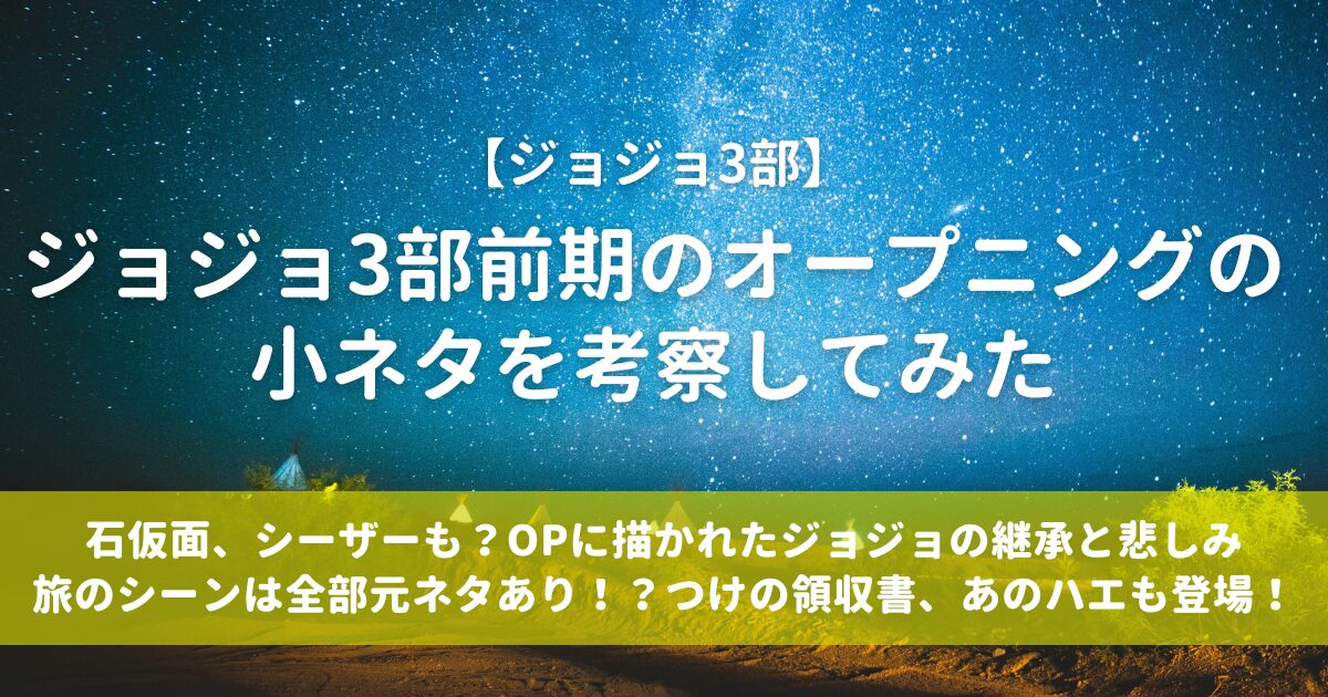 ジョジョ3部前期のオープニングの小ネタをまとめてみました。スピード感のある曲調と合いまった迫力あるバトルシーンや、各国を旅した3部らしい光景が織り交ぜられていたのではないでしょうか。