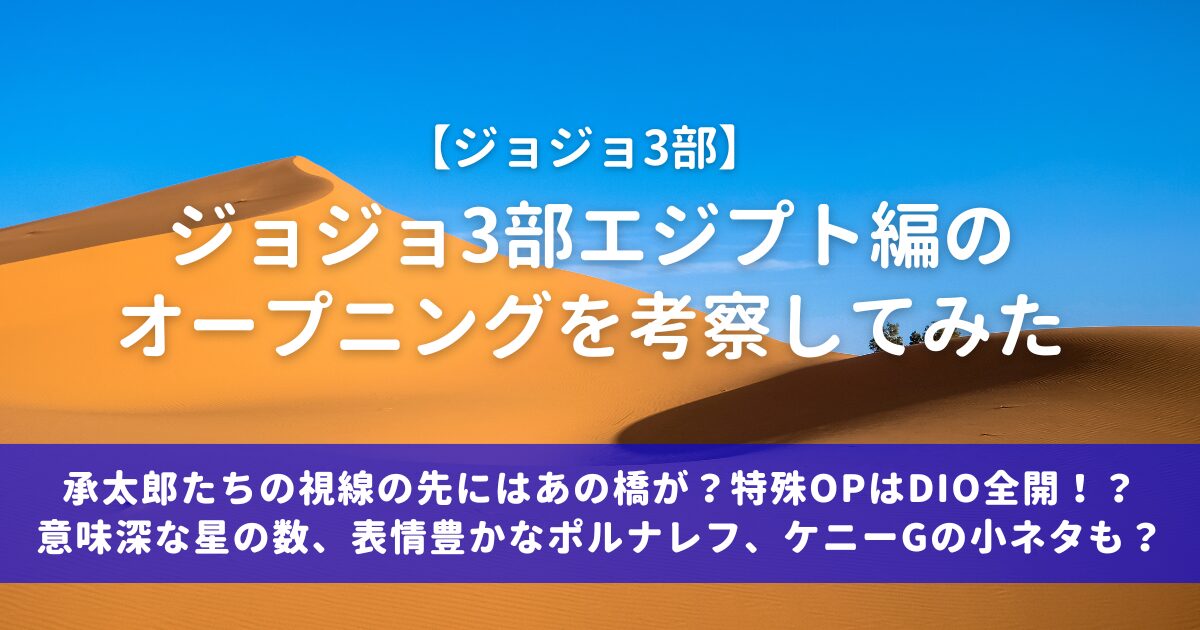 エジプト編オープニングについて考察してみました。ヴァニラ・アイス~DIO戦を中心とした小ネタが散りばめられており、見るたびに発見がありますよね~!