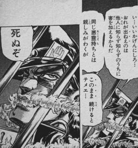弱者を踏みつけるのは悪!と他人への迷惑を許さなかった承太郎。だからこそスタープラチナは「悪」であり、「悪」を外に出すくらいなら牢屋にこもる方がマシと考えていたのではないでしょうか。ホリィの言うとおり、根は優しいんだもんね~!上のコマでアヴドゥルに「テメェ死ぬぞ」と忠告しているのも、実はけっこう優しいよな~…