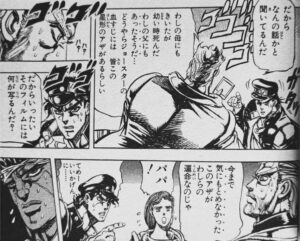 また姿勢にも注目してみると…いつもは仁王立ち、指をさしてビシッと決めるポーズなど、堂々としているイメージの承太郎が片足を立てて縮こまり気味に座っています。なんだからしくないのは、得体の知れない悪霊への恐れがあるゆえなのかもしれません。そりゃ~意味不明なものがつきまとっているなんてイヤだよな~…