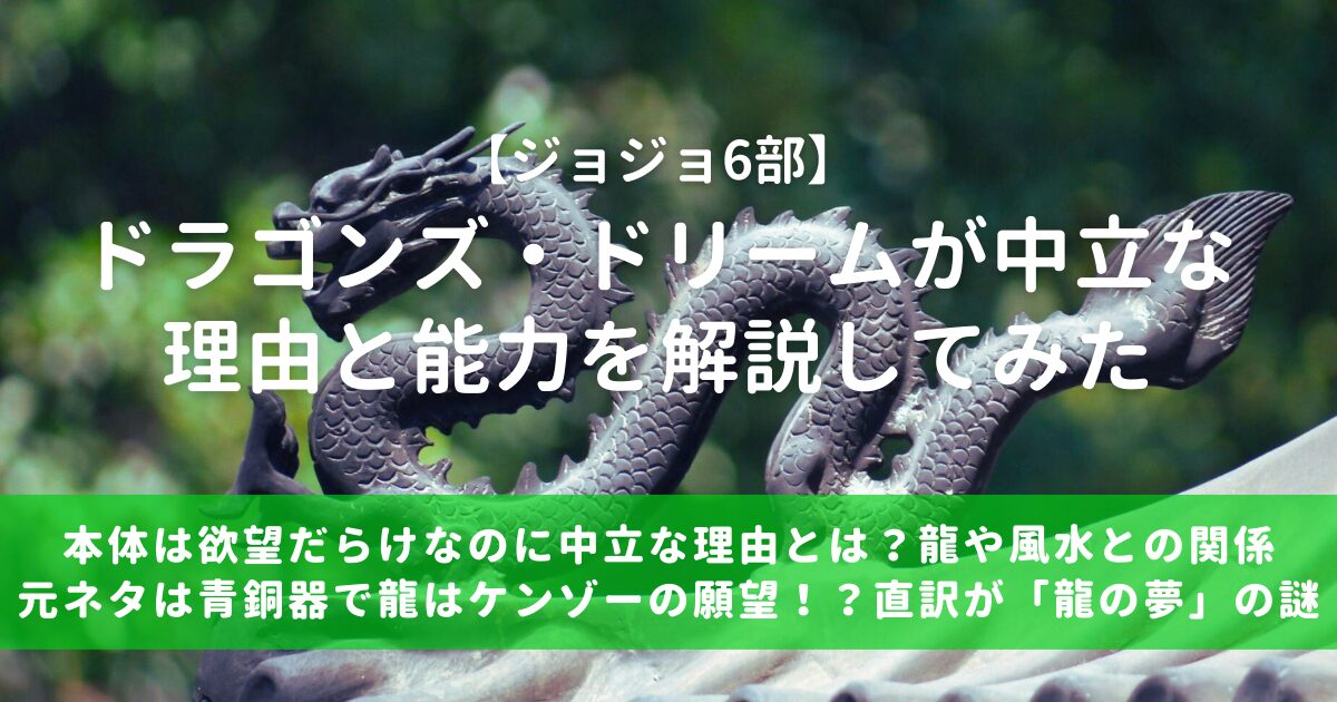 龍、風水、青銅器など様々な文化や美術品が融合していたドラゴンズ・ドリーム。能力だけではなく、その元ネタもジョジョ随一のユニークなスタンドだったのではないでしょうか。