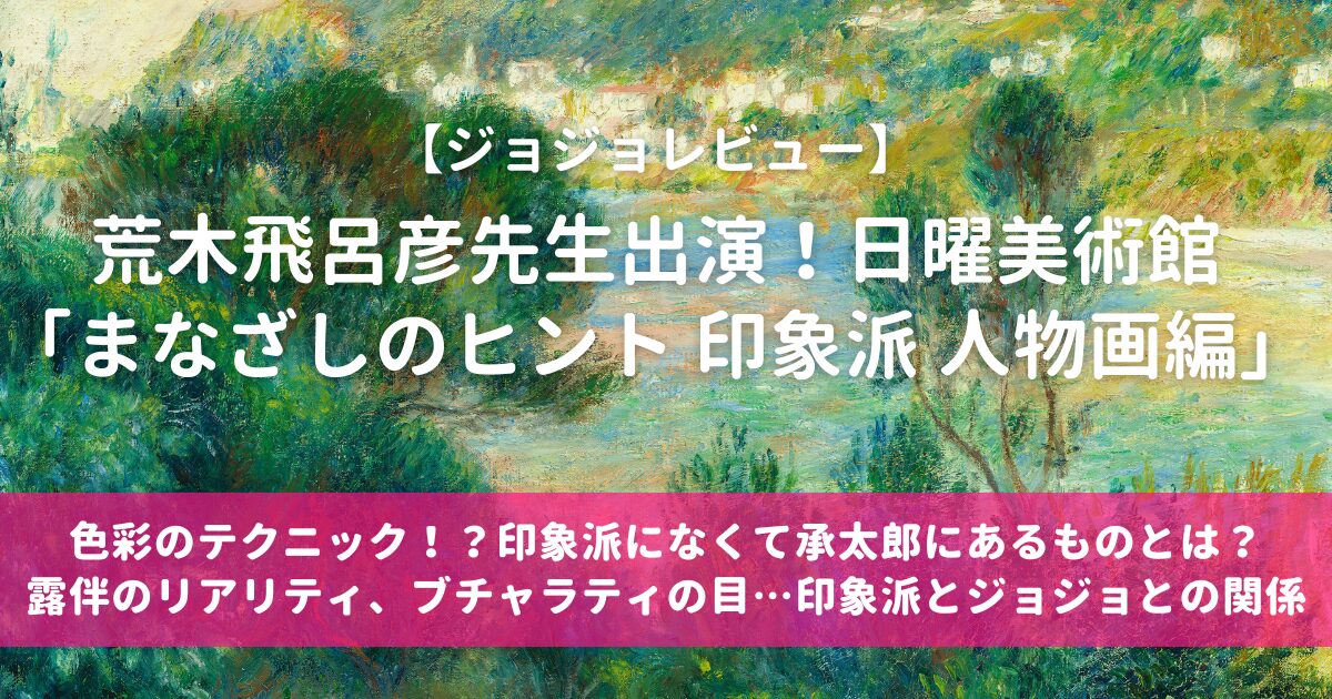 荒木先生ご出演の日曜美術館「まなざしのヒント 印象派 人物画編」について、ジョジョと絡めてレビューしてみました。印象派はジョジョで頻出の作品ではありませんが、荒木先生のコメントにはジョジョとの関連が伺えるのではないでしょうか。