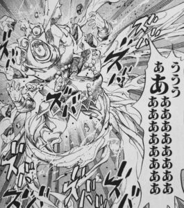 言葉にならない声を上げ、体はバラバラになりながら空に昇っていく重ちー。暗黒空間に飲み込まれたアヴドゥルなど、衝撃的な死を迎えても昇天シーンは安らかなジョジョにおいて、圧倒的なむごさではないでしょうか。鈴美ちゃんのように体があるまま彷徨うことすらできないんだろうな…